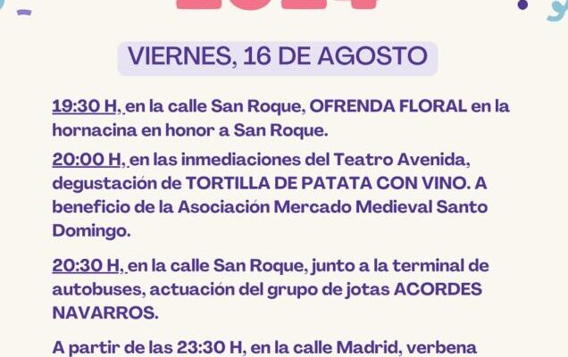 A las 19:30 horas, en la Calle San Roque, se ejecutará una pequeña ofrenda floral en la hornacina donde se encuentra la imagen del Santo. A las 20:00 horas, en las inmediaciones del Teatro Avenida se llevará a cabo la tradicional degustación de tortilla de patata con vino y será a beneficio de la Asociación del Mercado Medieval con el fin de recaudar fondos para tan afamado evento. Seguidamente, a las 20:30 horas, en la Calle San Roque, más concrétamente en la plazoleta de la terminal de autobuses, actuará el grupo de jotas “Acordes Navarros”. Por último, para terminar la jornada, tendrá lugar la verbena popular de San Roque que se celebrará en la Calle Madrid a partir de las 23:30 horas a cargo de la discoteca móvil `De fiesta en fiesta´.