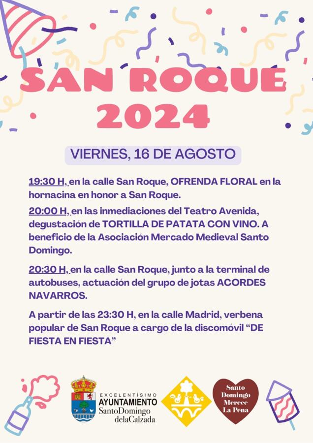 Ante la llegada del 16 de agosto, «desde la Concejalía de Cultura y Festejos se ha elaborado un programa de actos para celebrar una de las fiestas que, en los años 90, tuvo mucha popularidad en Santo Domingo de la Calzada y más concrétamente en el barrio que lleva el nombre de este santo: estamos hablando de la fiesta de San Roque.