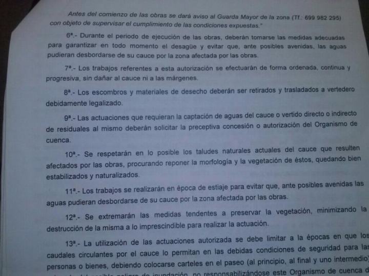 Seisas considera que estos condicionantes son interpretables y justifica la actuación al asegurar que se trata de `terreno urbano´. En el documento facilitado por el propio alcalde, y en el que se autoriza la construcción de los embarcaderos, entre otras actuaciones, también se contempla otro punto en el que se indica que: `Las acciones que requieran la captación de aguas del cauce o vertido directo o indirecto de residuos al mismo, deberán solicitar la preceptiva concesión o autorización al organismo de cuencas´.