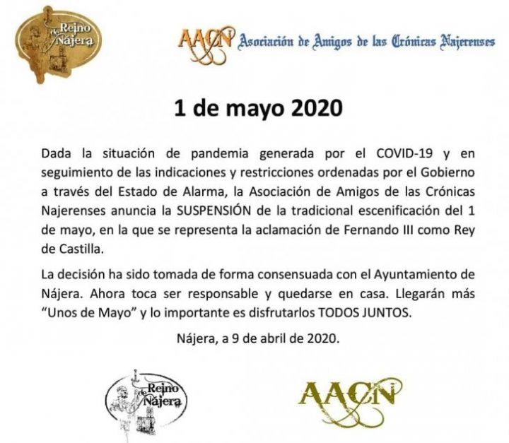 La Asociación de Amigos de las Crónicas Najerenses suspende la representación del 1 de mayo