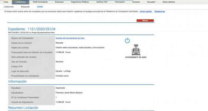 Y claro que hay sólo un adjudicatario es un contrato que no está dividido en lotes así que no puede haber más adjudicatarios. Pero sí que resulta cuando menos algo sospechoso .Por lo menos el agraciado es una persona de Haro, algo de lo que nos quejamos mucho por aquí si el que se lo lleva es de fuera.