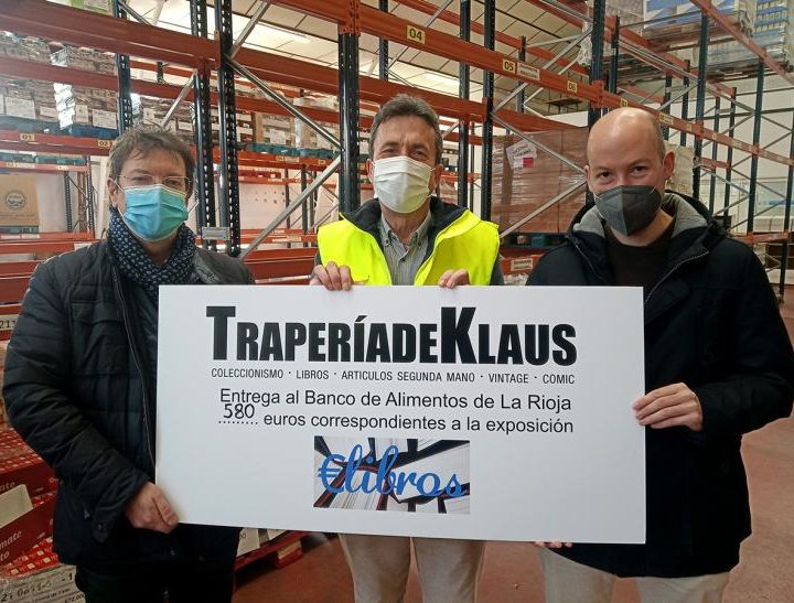 TraperíadeKlaus, la tienda logroñesa del coleccionismo, libros, artículos de segunda mano, vintage y cómic, que tuvo abierta en la calle Somosierra 5 de Logroño, un local dedicado enteramente a la II exposición €libros, en la que pusieron a la venta 3.000 libros, discos y CD, todos al precio de 1 euro, con un precio de entrada de 1 euro que daba derecho a adquirir 1 libro, disco o CD, ha hecho entrega al Banco de Alimentos de La Rioja 580 euros como resultado de esta actividad que unía cultura y solidaridad.