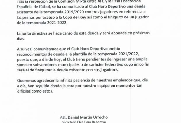 La Junta Directiva del Haro Deportivo asume la deuda existente con sus jugadores de la temporada 2019/2020