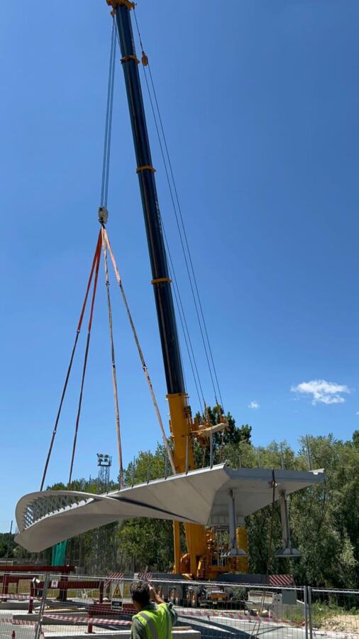 A falta de que se den por finalizados los trabajos, la estructura de la pasarela ya está presentada en su colocación definitiva. Una grúa de grandes dimensiones se ha encargado de elevar la pieza que servirá para enlazar el Barrio de la Estación con la zona deportiva de El Ferial.