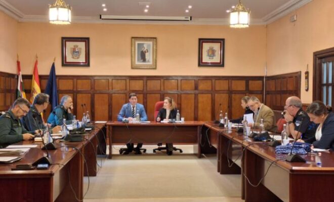 19 de octubre de 2023.- La delegada del Gobierno de España en La Rioja, Beatriz Arraiz Nalda, y el alcalde de Santo Domingo de la Calzada, Raúl Riaño, han presidido esta mañana la reunión de la Junta Local de Seguridad celebrada en el salón de plenos de la localidad. Los datos analizados en el transcurso del encuentro certifican que esta localidad de La Rioja Alta, con 6.242 habitantes, posee unos indicadores que consolidan su seguridad ciudadana.