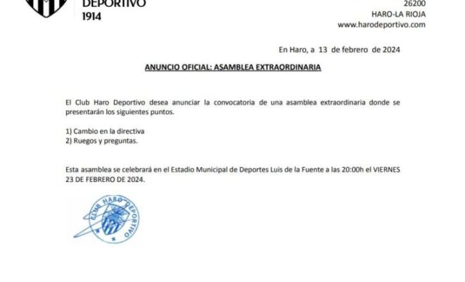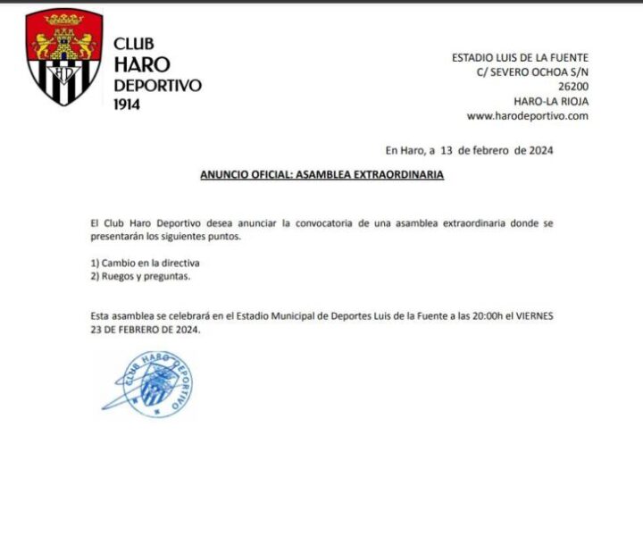 ℹ El Club Haro Deportivo anuncia en sus redes sociales «el final de la relación contractual entre el técnico Gonzalo Sánchez y la entidad. Desde el Haro le deseamos lo mejor en su futuro profesional y personal», señalan desde el Club blanquinegro y anuncian la convocatoria de la asamblea extraordinaria de socios para este viernes.