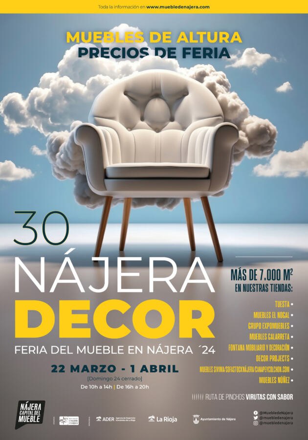 El Gobierno de la Rioja -a través de la Consejería de Economía, Innovación, Empresa y Trabajo Autónomo, y la ADER-, la Asociación El Mueble de Nájera y el Ayuntamiento de Nájera han presentado la trigésima edición de la Feria del Mueble de Nájera. Nájera Decor recupera sus fechas tradicionales para exponer al público las nuevas colecciones del sector del mueble. Estará abierta desde este viernes, 22 de marzo, hasta el 1 de abril, con la única excepción del domingo 24 de marzo, en horario partido (de 10 a 14:00 horas y de 16 a 20:00 horas).
