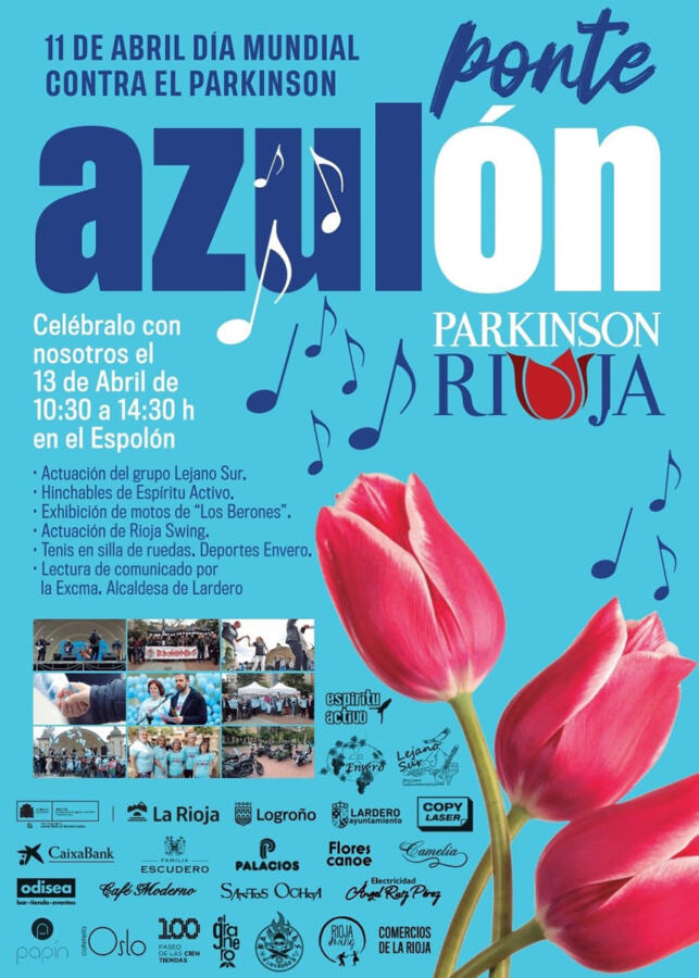 La Asociación Parkinson Rioja, fiel a su objetivo de informar y visibilizar la enfermedad de Parkinson, celebrará el Día Mundial del Parkinson aunque con un retraso de 2 días, de la mano de su Proyecto Ponte Azulón, en El Espolón logroñés, el sábado, 13 de abril, con una programación positiva y huyendo del drama, implicando a las familias y a los jóvenes.