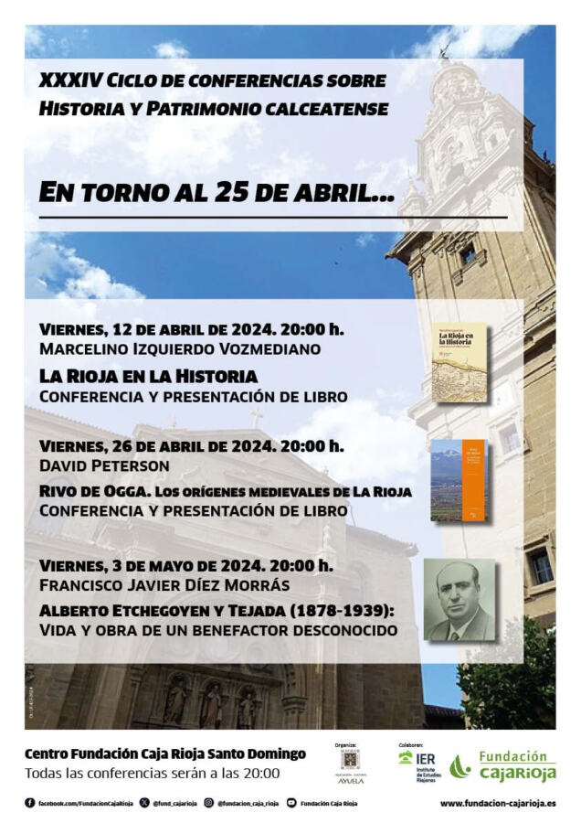 El Centro Fundación Caja Rioja Santo Domingo de la Calzada acoge desde este próximo viernes, 12 de abril, el XXXIV Ciclo de Conferencias sobre la Historia y el Patrimonio Calceatense. El periodista Marcelino Izquierdo Vozmediano inaugura estas jornadas que concluirán el 3 de mayo. Se desarrollarán a las 20:00 horas organizadas por la asociación Ayuela y la colaboración del Instituto de Estudios Riojanos y Fundación Caja Rioja.