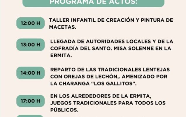 Los actos organizados vuelven a acoger novedades para todos los públicos conjugando así los actos tradicionales. A las 12:00 horas, habrá un taller infantil que consistirá en decorar y pintar macetas. A las 13:00 horas se producirá la llegada de la Corporación Municipal y de la Cofradía del Santo para celebrar de manera solemne en el interior de la Ermita la Eucaristía. Seguidamente, a las 14:00 horas, se iniciará el reparto de las tradicionales lentejas con orejas de lechón amenizado por la charanga “Los Gallitos”. Luego ya, por la tarde, se sucederán los juegos tradicionales con los bailes de la charanga para concluir la jornada con la recuperación del reparto popular de la costilla asada.