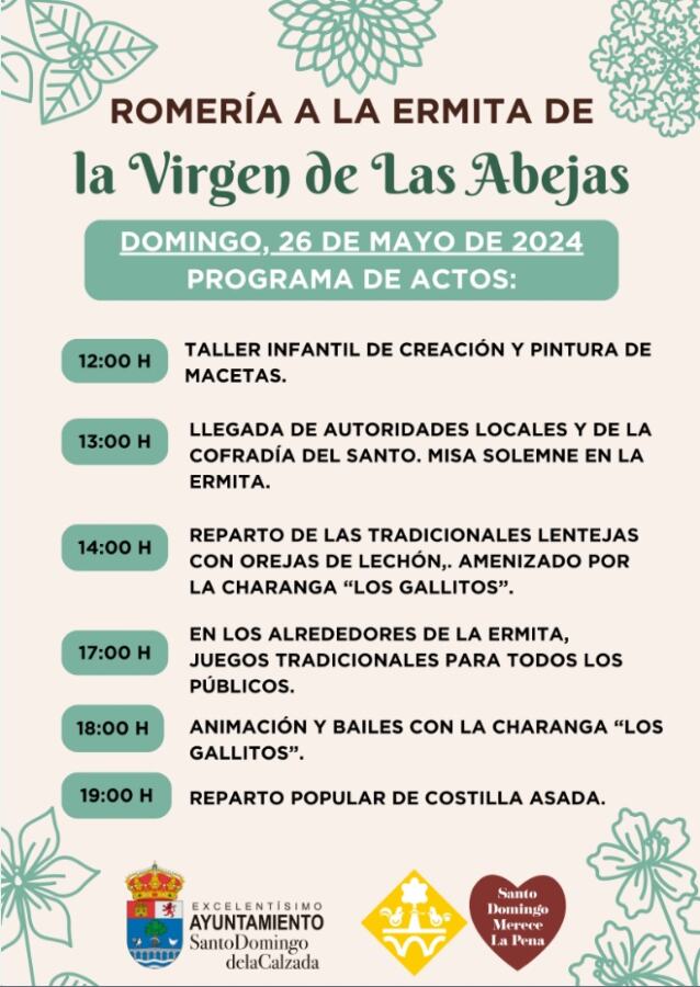 Tras la celebración de la primera de las dos romerías en honor a la Virgen de Las Abejas, organizada por la Cofradía de San Isidro, durante el martes 21 de mayo, el Martes de Pentecostés, desde la Concejalía de Festejos del Ayuntamiento de Santo Domingo de la Calzada «anunciamos que el próximo domingo, 26 de mayo, se celebrará la popular romería de Las Abejas, en este caso organizada por esta Concejalía y la Cofradía del Santo.