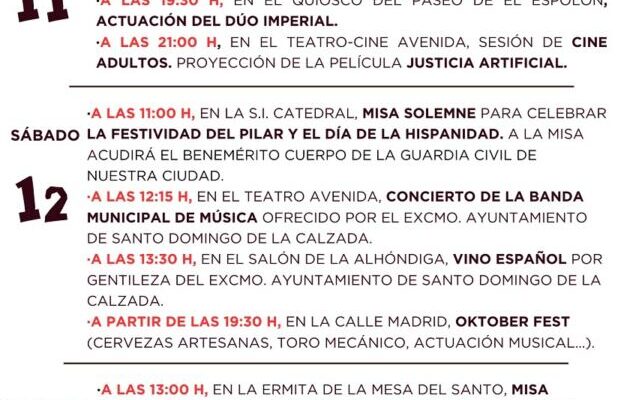 • A las 11:00 H, en la S.I., misa solemne para celebrar la festividad del Pilar y el día de la Hispanidad. A la misa acudirá el Benemérito Cuerpo de la Guardia Civil de nuestra ciudad.
