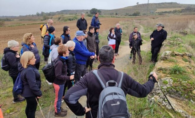 Varias paradas para disfrutar de las explicaciones de Carlos Mena, al caminar por lo que fue el camino secundario de la `Calzada Romana´ en el tramo de Angunciana a Briones y la correspondiente marca de cantero, por donde también discurre el Camino de Santiago Vasco-Riojano del interior.