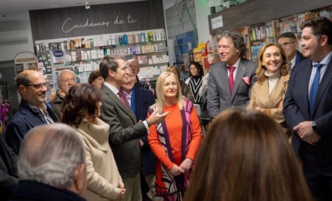 El presidente del Gobierno de La Rioja, Gonzalo Capellán, junto con los consejeros de Salud y Políticas Sociales, María Martín, y de Hacienda, Gobernanza Pública, Sociedad Digital y Portavocía, Alfonso Domínguez, ha participado hoy, día 31, en Nájera, en la celebración del centenario de la Farmacia Mendiola.
