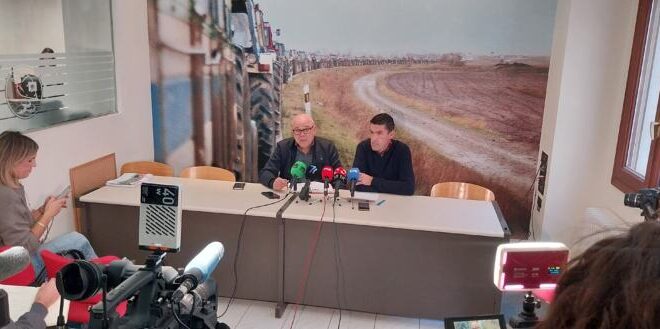 El presidente de la Unión de Agricultores, Óscar Salazar, y el coordinador sindical Roberto Ruiz-Clavijo, han ofrecido una rueda de prensa para abordar la grave crisis del sector vitivinícola riojano. En la rueda de prensa no ha podido participar el responsable vitivinícola de la UAGR-COAG, Roberto Salinas, por una indisposición de última hora.