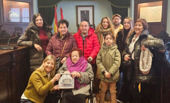 Rodeada de su familia, la homenajeada ha recibido el `Jarro´ de la ciudad.