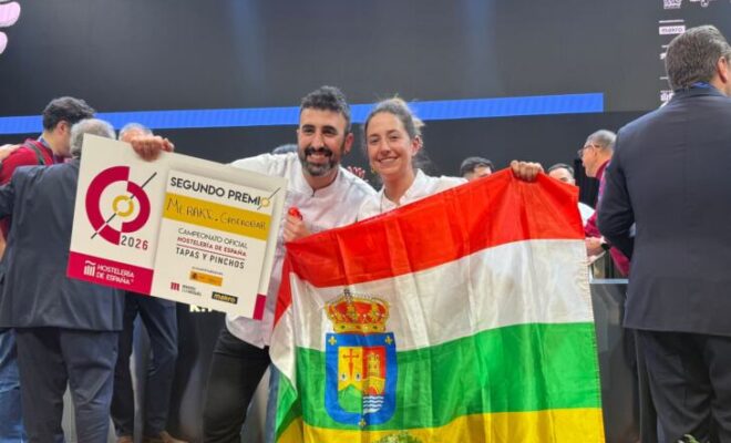 La Rioja ha obtenido el segundo premio en el Campeonato Nacional Oficial de Tapas y Pinchos “Hostelería de España” representada por el chef del Meraki Gastrobar de Nájera, Enrique Fernandez, quien ha concursado con la tapa “El Danzador”, elaborada con productos riojanos como la Alubia de Anguiano, Chorizo Riojano, costillar de cerdo adobado, oreja de cerdo adobada, trozos de espinazo, cebolleta, pimentón y Aceite de La Rioja.