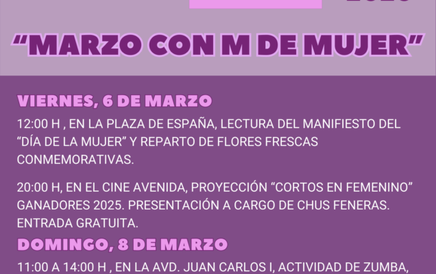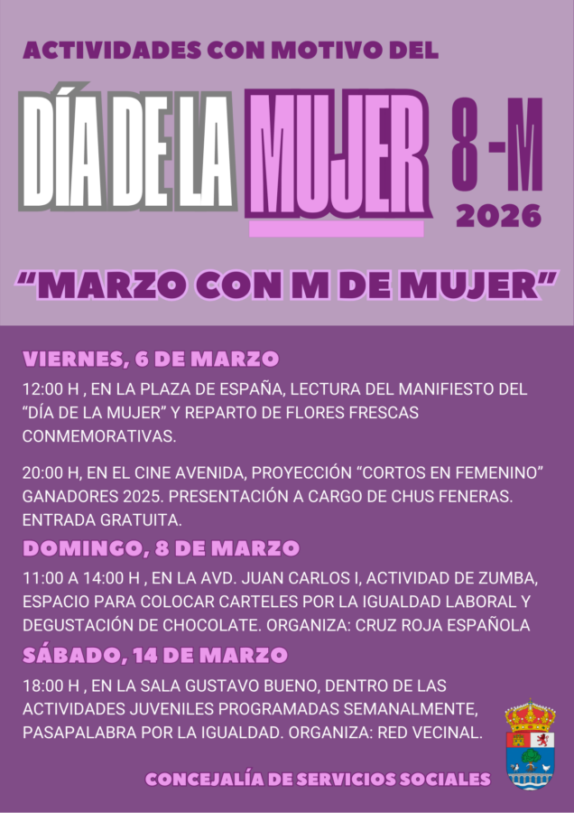 Desde la Concejalía de Servicios Sociales se invita a toda la ciudadanía a participar en las actividades programadas y a hacer de este mes de marzo un espacio de reflexión, reconocimiento y compromiso colectivo con la igualdad real y efectiva entre mujeres y hombres.