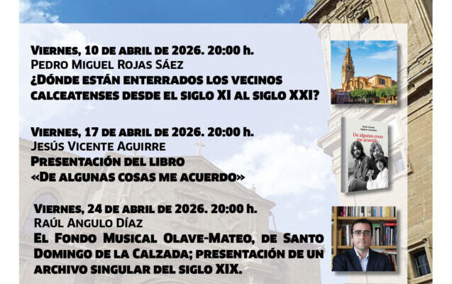 Este viernes comienza en el Centro Fundación Caja Rioja Santo Domingo de la Calzada el ciclo de conferencias sobre historia y patrimonio calceatense “En torno al 25 de abril”, organizado por la asociación cultural Ayuela. Se prolongará hasta el 8 de mayo; todas las actividades, con entrada libre, comenzarán a las 20:00 horas.
