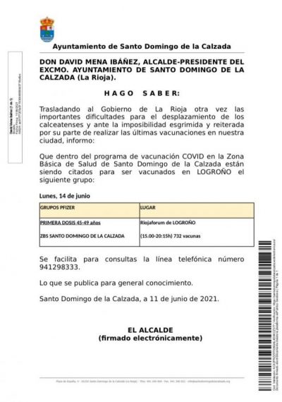 El Ayuntamiento de Santo Domingo informa de que los habitantes de la zona de Salud calceatense, de entre 45 y 49 años, serán vacunados ...