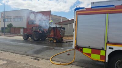 Los Bomberos sofocan en Nájera el fuego registrado en un empacadora de paja que transportaba un tractor