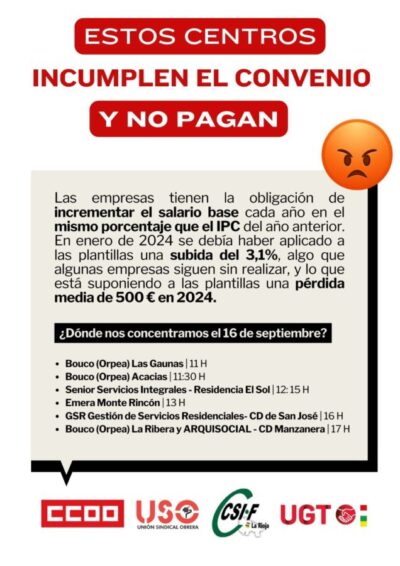 Los sindicatos negociadores del convenio regional de Residencias anuncian movilizaciones para denunciar su incumplimiento en algunos centros