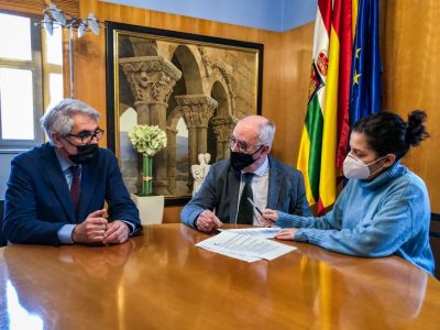 El consejero de Educación, Cultura, Deporte y Juventud, Pedro Uruñuela, y la alcaldesa de Haro, Laura Rivado, firman un convenio de colaboración por el ...