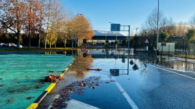 Corte de tráfico en el Barrio de la Estación de Haro por el aumento del caudal de los ríos Ebro y Tirón