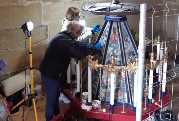 Las encargadas de corregir los desperfectos de este singular elemento procesional de Santo Domingo destacan el simbolismo de la actuación.