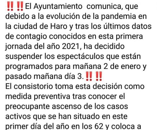 El Ayuntamiento de Haro comunica que, «debido a la evolución de la pandemia en la ciudad de Haro y tras los últimos datos de contagio conocidos ...