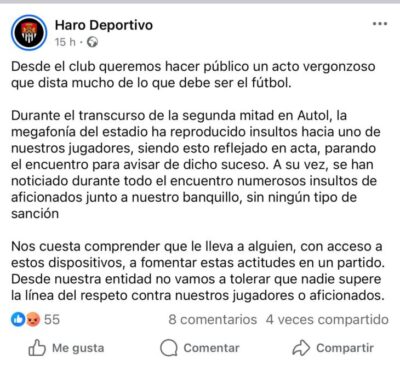 El Haro Deportivo denuncia insultos hacia un jugador y hacia el banquillo en el partido contra el Autol