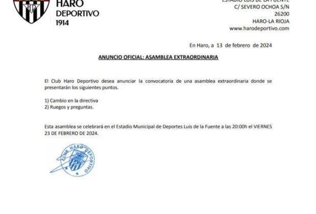 ℹ El Club Haro Deportivo anuncia en sus redes sociales «el final de la relación contractual entre el técnico Gonzalo Sánchez y la entidad. Desde el ...