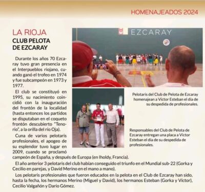 El Club de Pelota de Ezcaray, homenajeado por la Asociación de Amigos de la Pelota `Pilotarien Batzarra´