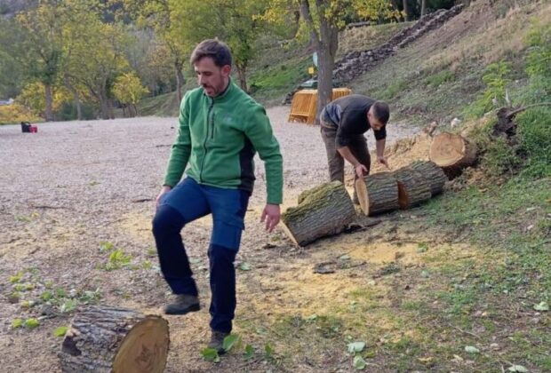 El guarda contratado por el Ayuntamiento de Haro, el concejal Borja Merino y la Sociedad Riojalteña de Caza retiran un árbol caído por el viento en San Felices