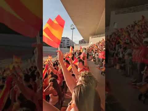 Llenazo en el Estadio de Deportes. Banderas de España y camisetas de la selección dan color al graderío.