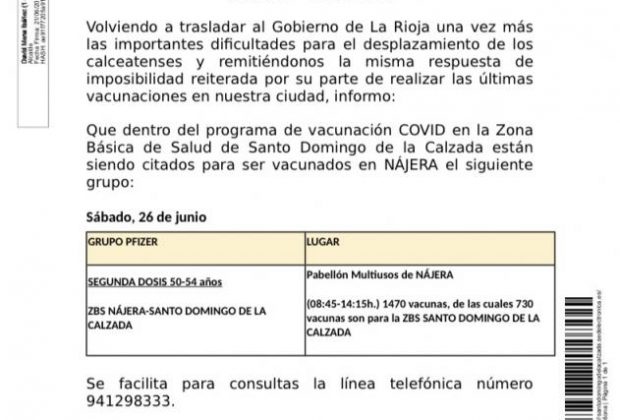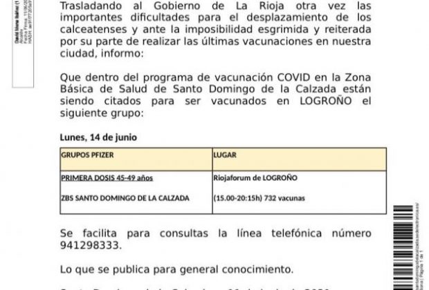 El Ayuntamiento de Santo Domingo informa de que los habitantes de la zona de Salud calceatense, de entre 45 y 49 años, serán vacunados este lunes ...