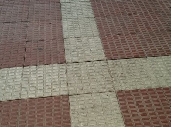 Baldosas sueltas en la acera arreglada en la calle de la Vega