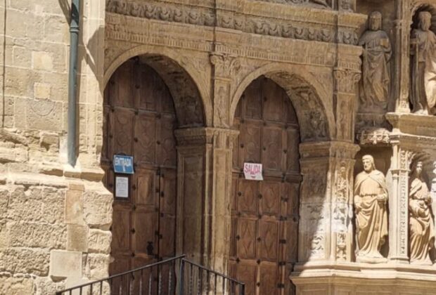 FOTODENUNCIAS | A quién corresponda: ¿Por qué estropean con esos carteles de entrada y salida el pórtico de la parroquia de Haro?
