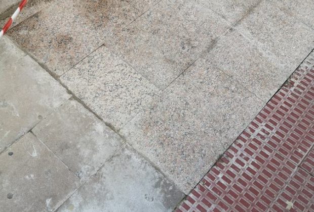 Vergüenza!!! Hasta tres baldosas distintas en la misma acera, tras unas obras en la calle de la Vega