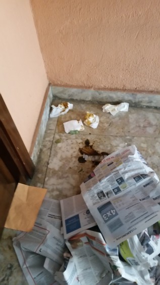 Mi solidaridad con el equipo de limpieza, pues la deposición tiene pinta de estar en el grupo de las pegajosas, y cuesta con ratito el borrar las huellas. Acto seguido sea generoso con la lejía, para desinfectar el terrazo, por cierto del tipo de toda la vida, y el mocho de la fregona le recomiendo lo arroje directamente a la basura. No sé si podrá ampliar algún dato sobre el hedor, si pertenecía a los inaguantables, o solamente mal oliente sin más.