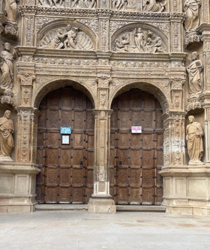 Totalmente de acuerdo, Nuestra Maravillosa Portada de 1516, estilo Plateresco, realizada por Felipe de Biguerny. Declarada Monumento Nacional el 3 de Junio de 1931 y ratificado el 14 de Abril de 1944, no se merece estos carteles, en esas puertas separadas por un parteluz, en fin no sigo, pues estoy muy triste.