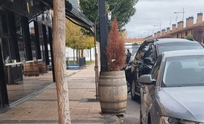 Dicha terraza ya no está en funcionamiento, y las barricas, que ahora contienen suciedad y pinos secos en su interior, representan un obstáculo que dificulta el aparcamiento.