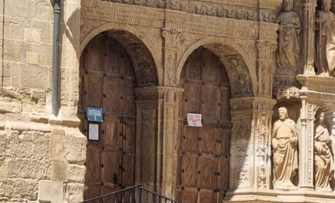 De paso, un poco más a la izquierda, se conserva todavía una mal borrada inscripción, de un tal José Antonio Primo de Rivera. Supongo que responde a la proverbial dejadez jarrera. También la cañería bajante y las farolas de ese color afean la fachada.