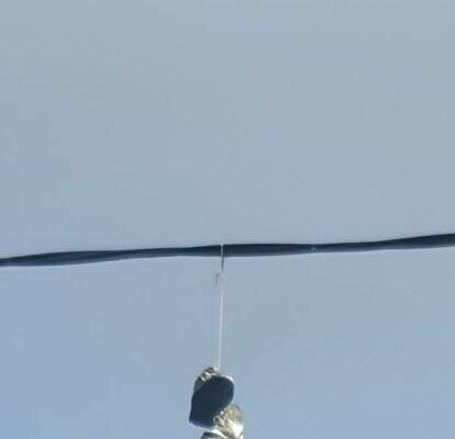 Hombre, pues mira que hay cables en Haro. Ya nada más intentarlo colgar ahí no es por diversión. Algún significado tendrá. Que se vea bien es la finalidad, no? Hay que llevar unas zapatillas hasta ahí. Y luego lanzarlas. Casualidades, pocas eh.