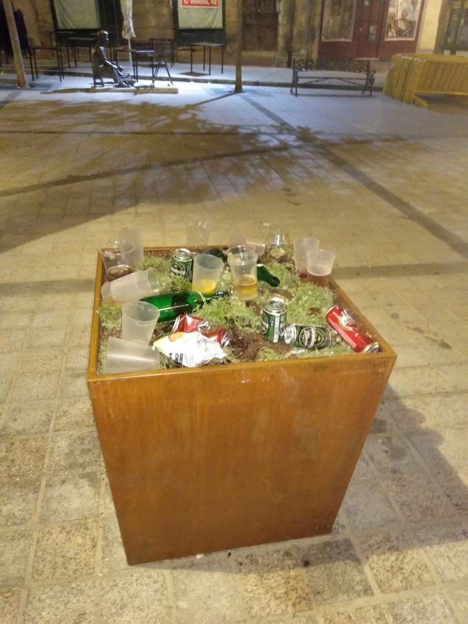 Los que no es normal es que no repartan cubos y contenenedores de basura por la plaza. Si hubiese un contenedor al lado del tiesto ese quizás no estaria lleno mierda.