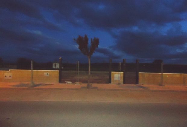 ÁRBOL DELANTE DE UNA PUERTA DE GARAJE EN LA CALLE MIGUEL DE CERVANTES