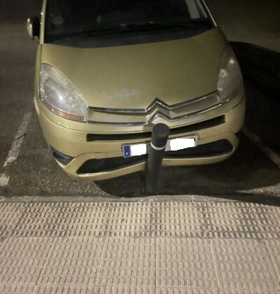 Este coche lleva por lo menos una semana aparcado de esta manera en el ambulatorio . Esto no es denunciable , q culpa tiene el bolardo ...