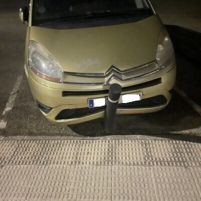 Este coche lleva por lo menos una semana aparcado de esta manera en el ambulatorio . Esto no es denunciable , q culpa tiene el bolardo ? Q tu no sepas aparcar